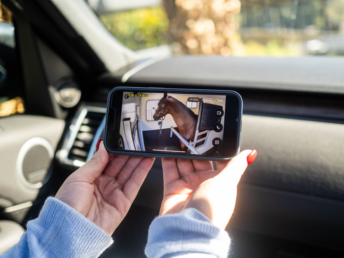 The Equine Eye Vision camera runs off a free app, available in the Apple and Google Play stores. It does require a data SIM to connect the camera to a cellular data network (like your mobile phone), which then enables you to see the live video feed from your mobile, anywhere in the world. This means the camera has no distance restrictions. It does need a decent 4G or 5G signal in the location it is being used.